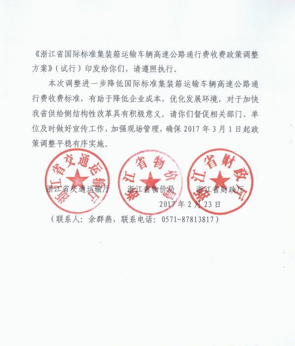 浙江省國際標準集裝箱運輸車輛高速公路通行費收費政策調整方案(試行) 浙交[2017]23號