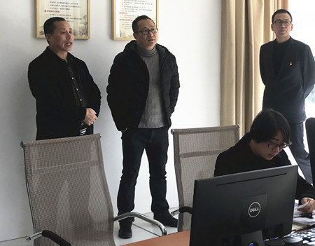 圖為集團副總經理章海峰一行在監(jiān)控室檢查監(jiān)控設備