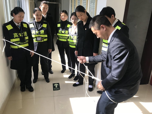 圖為演練現場 隨著所長孫明偉提問式的開場白,近日,臨海南收費所以班組為單位,分四天集中開展全員逃生繩演練活動。全所員工積極參與、親身體驗,活動達到預期效果。 整個演練過程中,培訓人員詳細講解了打繩結的方法與注意要點,現場氣氛踴躍。通過開展此次活動,本所員工不僅掌握了逃生繩的使用方法,提高了高層逃生自救能力,而且進一步提高了面對突發火情的應對能力,增強了“防火防災”的安全意識。 陳瑩