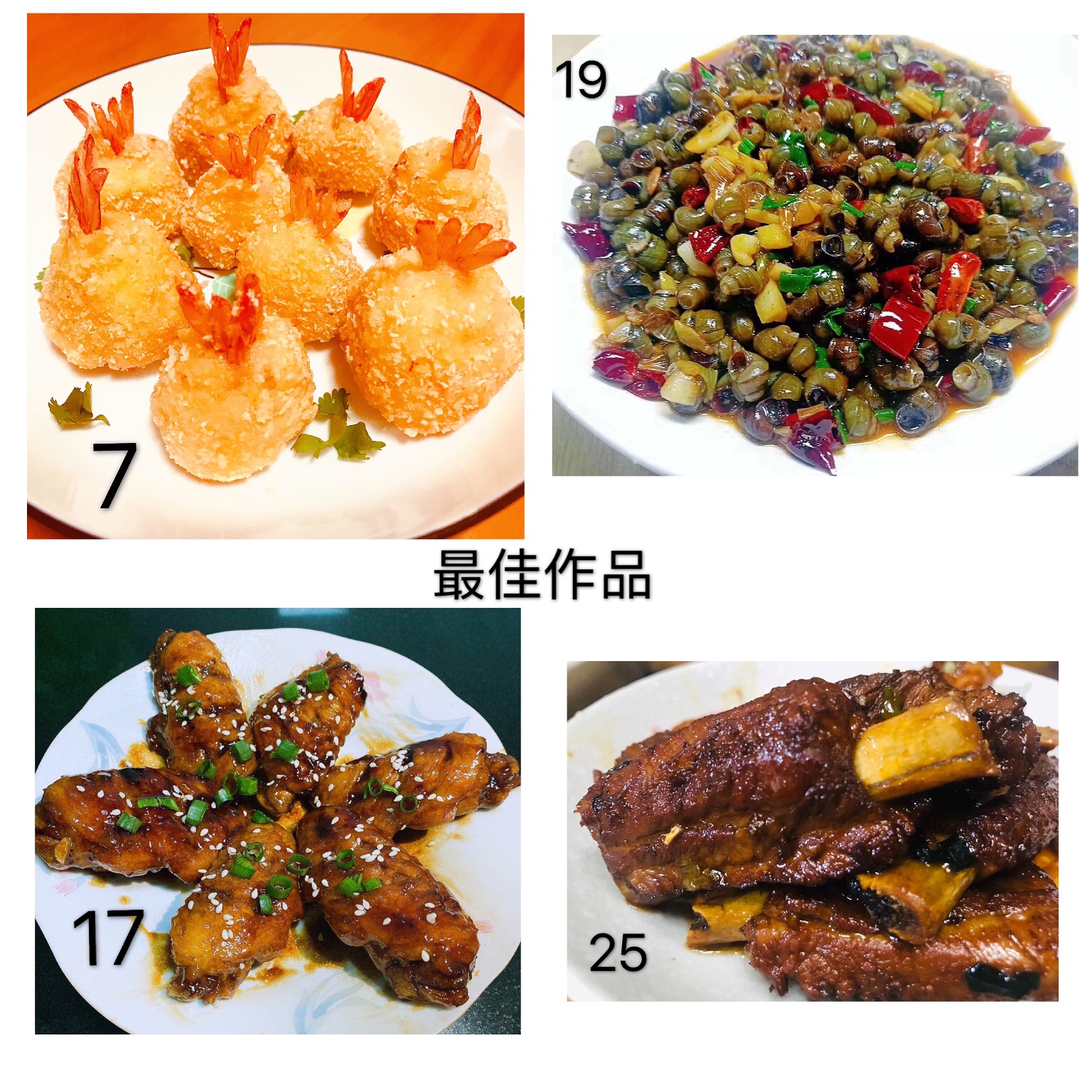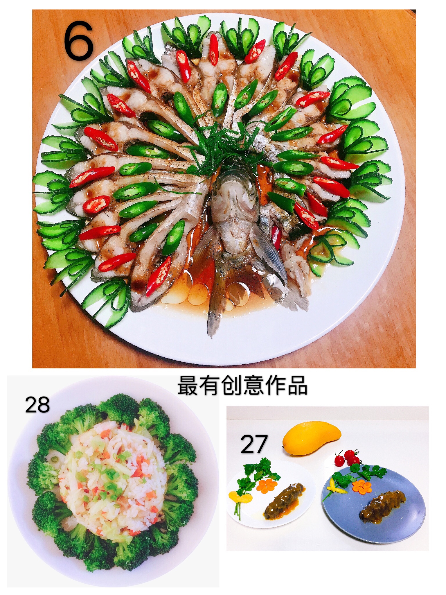 本次活動(dòng)共32幅作品進(jìn)行參評(píng),最終評(píng)選出朱英英的《鳳尾蝦球》、謝海云的《饞嘴螺絲》、李菊麗的《昂翔展翅、陳瑩的《骨色骨香“最佳作品”,朱英英的《孔雀開(kāi)屏》、葉懿慧的《向陽(yáng)花》、吳琴琴的《秋收》為“最有創(chuàng)意作品”。大家紛紛相約疫情過(guò)后,以廚會(huì)友、以食為樂(lè),來(lái)一場(chǎng)百家宴一飽口福。