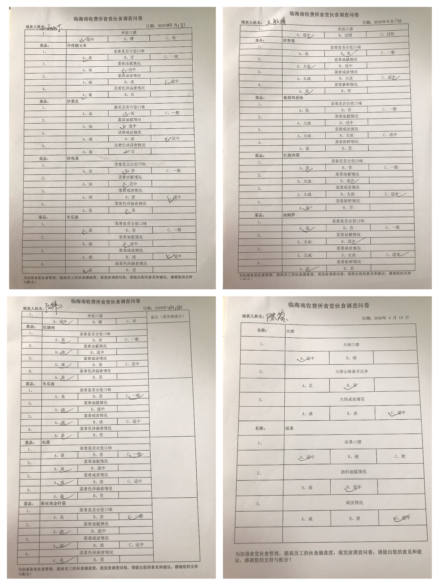 為了提高食堂滿意度,該所從菜肴口味、油膩度、咸淡、色澤等方面制定調(diào)查問(wèn)卷,讓大家真實(shí)客觀地表達(dá)各自的想法和建議。問(wèn)卷調(diào)查采用當(dāng)班用餐人員實(shí)名填寫(xiě)問(wèn)卷調(diào)查表的形式進(jìn)行,通過(guò)收集的問(wèn)卷,每天中午定期召集食堂人員,反饋前一天的調(diào)查結(jié)果,根據(jù)員工的反饋建議,討論制定整改措施,確保將員工的意見(jiàn)及建議落到實(shí)處。除此之外,每逢傳統(tǒng)佳節(jié),定制相應(yīng)的節(jié)日菜譜,保證員工在站所也能感受到節(jié)日的喜慶和家的溫馨。