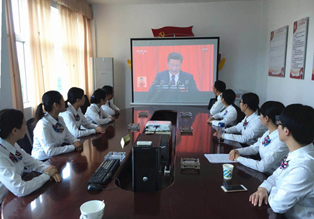 圖為員工在認(rèn)真收看十九大開(kāi)幕會(huì)