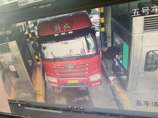 圖為失主遺落錢財現場 當天上午,收費班長李寧巡查時在第五車道窗口附近發(fā)現了三百元現金,經多方確定不是所內工作人員遺失后,判斷為過往司機不小心遺失。為了盡快找到失主,李寧隨即去監(jiān)控室調取視頻查找。 經過監(jiān)控查找,馬上鎖定了一輛車牌為“豫”字開頭的大貨車。原來當時因駕駛室距離窗口較遠,司機下車付錢,監(jiān)控中清晰顯示司機在掏錢繳費時三百塊現金從口袋里掉到車道上,但是司機因為趕路絲毫沒有發(fā)覺。確認失主后,工作人員查詢司機電話并取得聯系,告知其遺失三百現金,在通過微信確認身份后,李寧將錢轉給了司機。