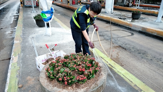 圖為栽種現場 現場,志愿者們身穿反光背心,拿著鋤頭、鐵鍬、水桶,帶著事先買來的小花苗,來到收費區(qū)域的島頭開始栽花活動。所領導班子成員身體力行,帶領大家投入到緊張的勞動中。大家挽起衣袖,不怕臟、不怕累,有的松土、有的種花、有的填土,有的澆水……有序地將一棵棵花苗栽進土壤。 通過大家的共同努力,經過近4個小時的時間,400棵樹苗被栽進了20多個大花盆中,美化了整個車道環(huán)境。 此次栽花活動增強了大家的生態(tài)環(huán)保意識和綠化意識,大家紛紛表示添花更要護花,要將綠化活動意識長期付諸實踐,共同建設美麗溫嶺西收費站。 鄭霞霞