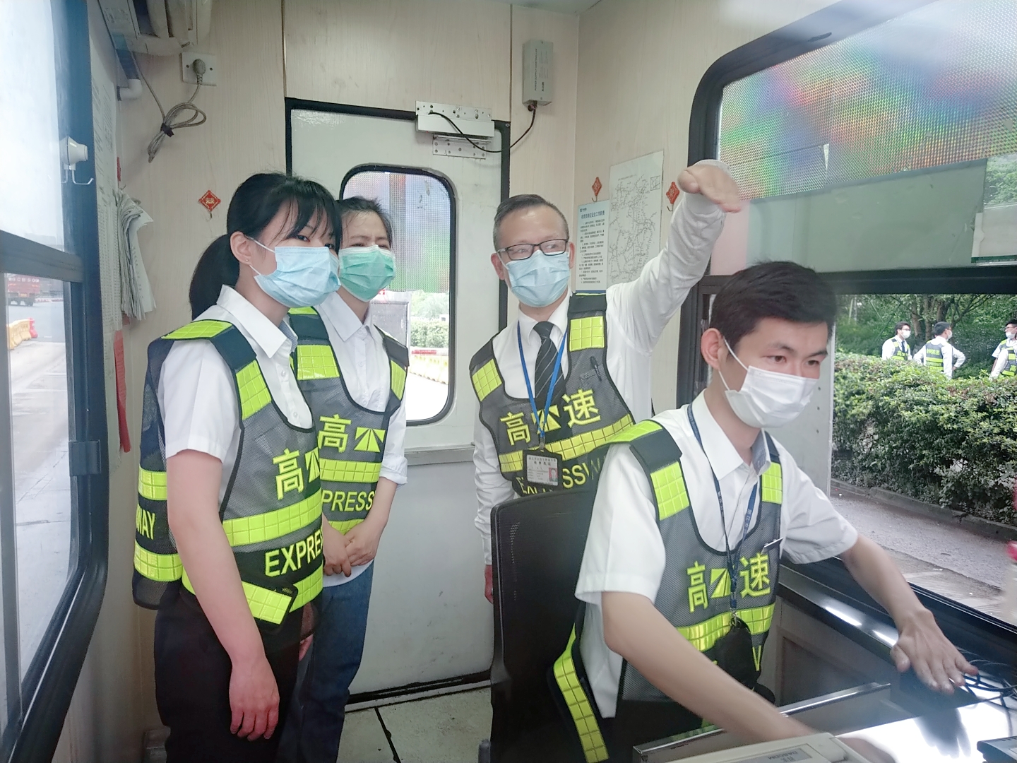 圖為陳軍帶領新員工在崗亭培訓 新員工的到來,為該所注入了新鮮的血液,增添了青春活力。為了讓新員工能夠快速“入鄉隨俗”,盡快適應收費站工作環境,順利完成角色轉換,當日他們就跟著資深班長陳軍學習相關業務知識。
