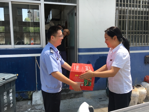 圖為楊瑩瑩給民警送上清涼物資 連日來,全市持續高溫,熱浪滾滾,進入酷暑“燒烤”模式,高溫烈日下,廣大民警、輔警舍小家、顧大家,堅守在一線崗位上,楊瑩瑩囑托民警、輔警們在高溫天氣執勤中一定要注意身體。 大溪派出所所長代表全體民警對臺州高速溫嶺西收費所的慰問表示感謝,同時表示所將一如既往做好本職工作,不負期望,在今后的工作中再接再厲,為營造更加和諧、穩定的社會環境繼續努力。 鄭霞霞