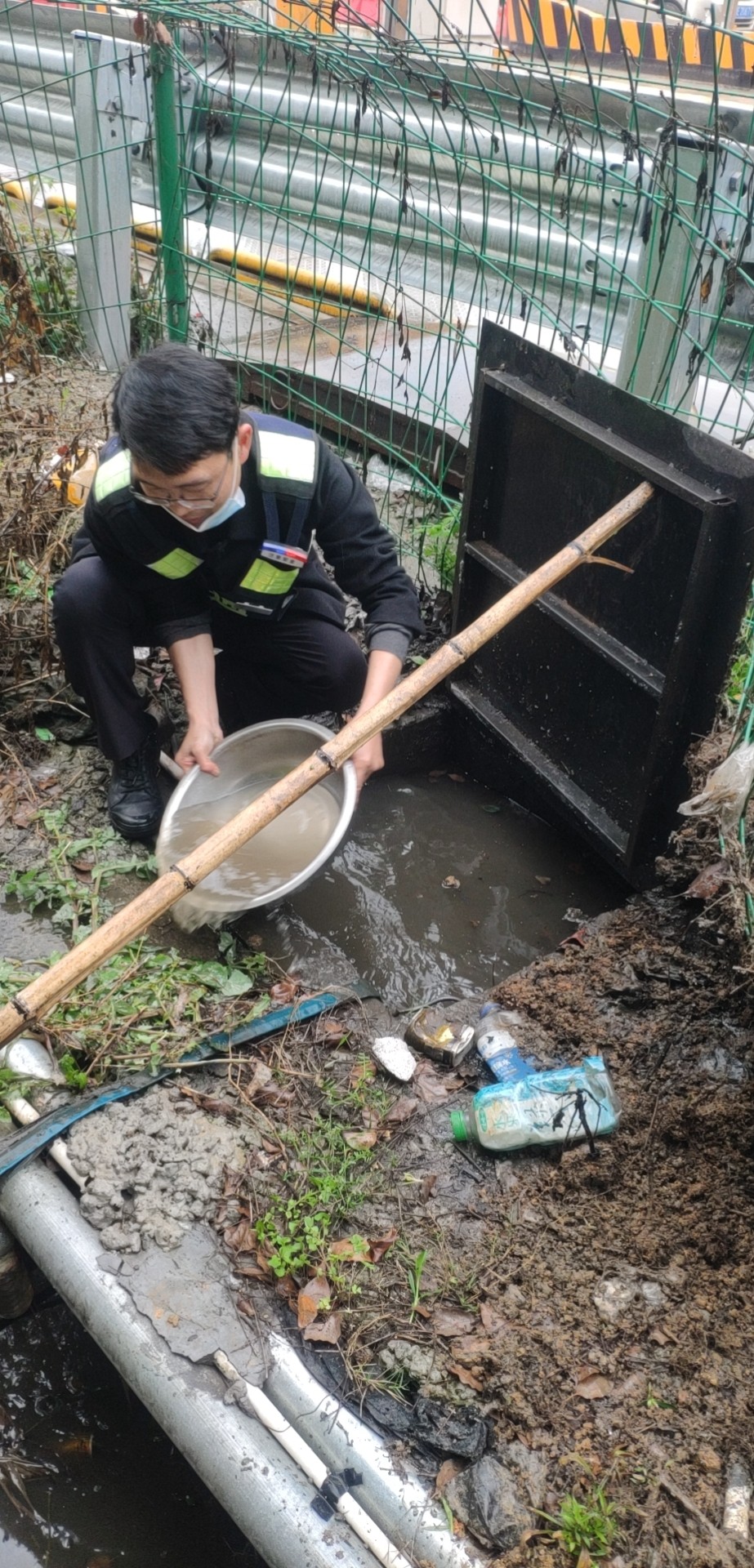 找出原因后,鄭星趕忙跑到所里取來一個水盆和一根木桿子。他用木桿支起排水坑上的蓋板,將坑里的積水一盆一盆地舀到旁邊的排水溝里。引導完車輛的林華平也過來協助鄭星。雖然此時外面下著雨,但他們全然沒顧上,只盼著舀水這個措施能夠有效,11號車道能夠早點恢復使用,進口秩序能夠早點恢復正常。 最后在鄭星和林華平的冒雨搶修下,排水坑里的水位總算有所下降,11號車道在關閉二十多分鐘后終于恢復使用,進口車輛也恢復暢通。 因地磅傳感器長期被雨水浸泡,可能還存在一些潛在問題。再者,排水坑里的水位雖有所下降,單憑人力實在無法在短時間內排掉剩余積水。考慮到這些問題,班長在搶修過后又將情況匯報給了維養中心,維修人員后序針對地磅問題進一步展開排查和維修工作。 趙育辰