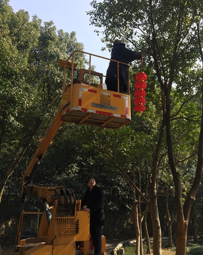 圖為黃土嶺隧道所員工合影 “往左往左,站臺(tái)再下降一點(diǎn)。”金先華麻利地操作著登高車,“爬樹高手”金美忠自然地肩負(fù)起了懸掛燈籠的任務(wù),而個(gè)子高高的廖科則負(fù)責(zé)遞燈籠,其它人員有的負(fù)責(zé)將燈籠系好鐵絲,有的負(fù)責(zé)扛梯子,有的則不時(shí)地在遠(yuǎn)點(diǎn)兒的位置仔細(xì)看燈籠掛得正不正, 兩個(gè)燈籠高度是否一致,對聯(lián)是否對齊等等。大家有說有笑,忙得不亦樂乎! 不一會(huì)兒工夫,喜慶的春聯(lián)貼起來,紅紅的燈籠串掛起,管理所員工在一片喜氣的歡樂氛圍中共同期待著的新年的到來! 林 玲