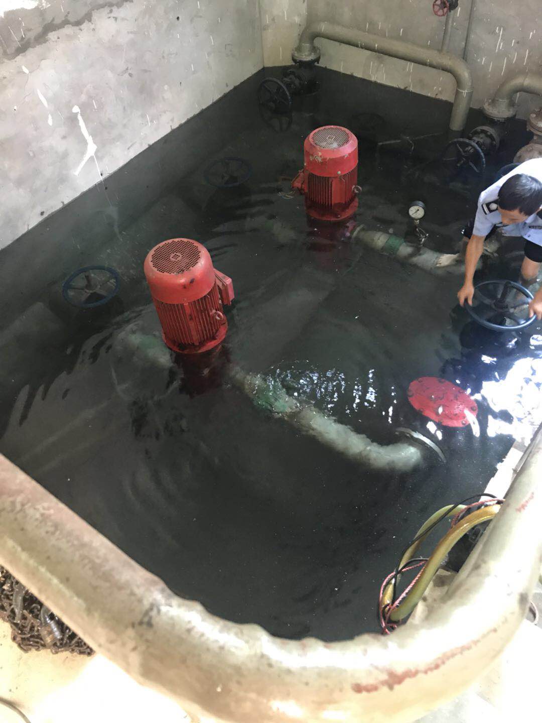 圖為執(zhí)勤隊(duì)員在關(guān)閉閥門 “看,應(yīng)該是這里漏水了,有水暈在動(dòng)?!?/span> “對(duì),就是這里了?!?/span> “水馬上要沒到電機(jī)了,趕快關(guān)閉閥門,不然損失就大了?!?/span> 此時(shí),陳旦平?jīng)]有多想,立即下水去關(guān)閉水泵閥門。池中有2號(hào)泵的高位水池閥門和2號(hào)泵的集水池閥門,每個(gè)泵各有兩個(gè)閥門。陳旦平在迅速關(guān)閉閥門后,由于集水池這邊地勢(shì)較低,慌忙中的他忘拿手機(jī),手機(jī)被水浸到,他卻依舊埋頭于搶修。 據(jù)隊(duì)長(zhǎng)李新波說,此次“水災(zāi)”是北泵房2號(hào)泵的壓力表處水管漏水,原因是設(shè)備設(shè)施使用時(shí)間較長(zhǎng),水管陳舊銹蝕,抵不住水壓,導(dǎo)致水管開裂,引起漏水。 胡瑰華