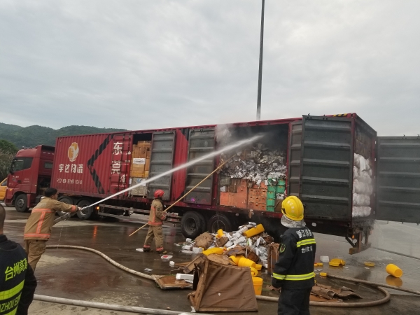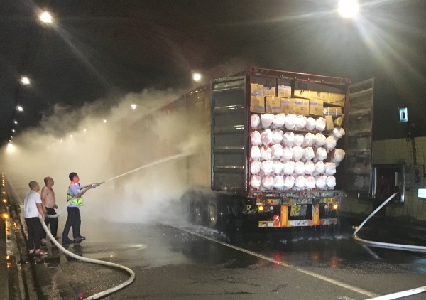 圖為滅火現(xiàn)場 萬幸的是,恰逢溫州高速交警巡邏車經(jīng)過,隨即在該貨車后方預(yù)警,很快的所巡邏車、消防車先后到達現(xiàn)場協(xié)同滅火。由于該車貨物較多,且裝載物皆為紙箱和塑料,集裝箱底層溫度較高,一時只能將明火撲滅,但車廂內(nèi)仍有大量煙霧,為了安全,車子必須盡快撤離隧道,執(zhí)勤隊當(dāng)即決定讓駕駛員把車開往南廣場繼續(xù)滅火,消防車則一路緊隨其后滅火,以防火勢變大。 05:02分,大貨車終于開至南廣場,消防隊員對車上的貨物進行清理,才徹底將此次火災(zāi)撲滅,隧道恢復(fù)安全行車。