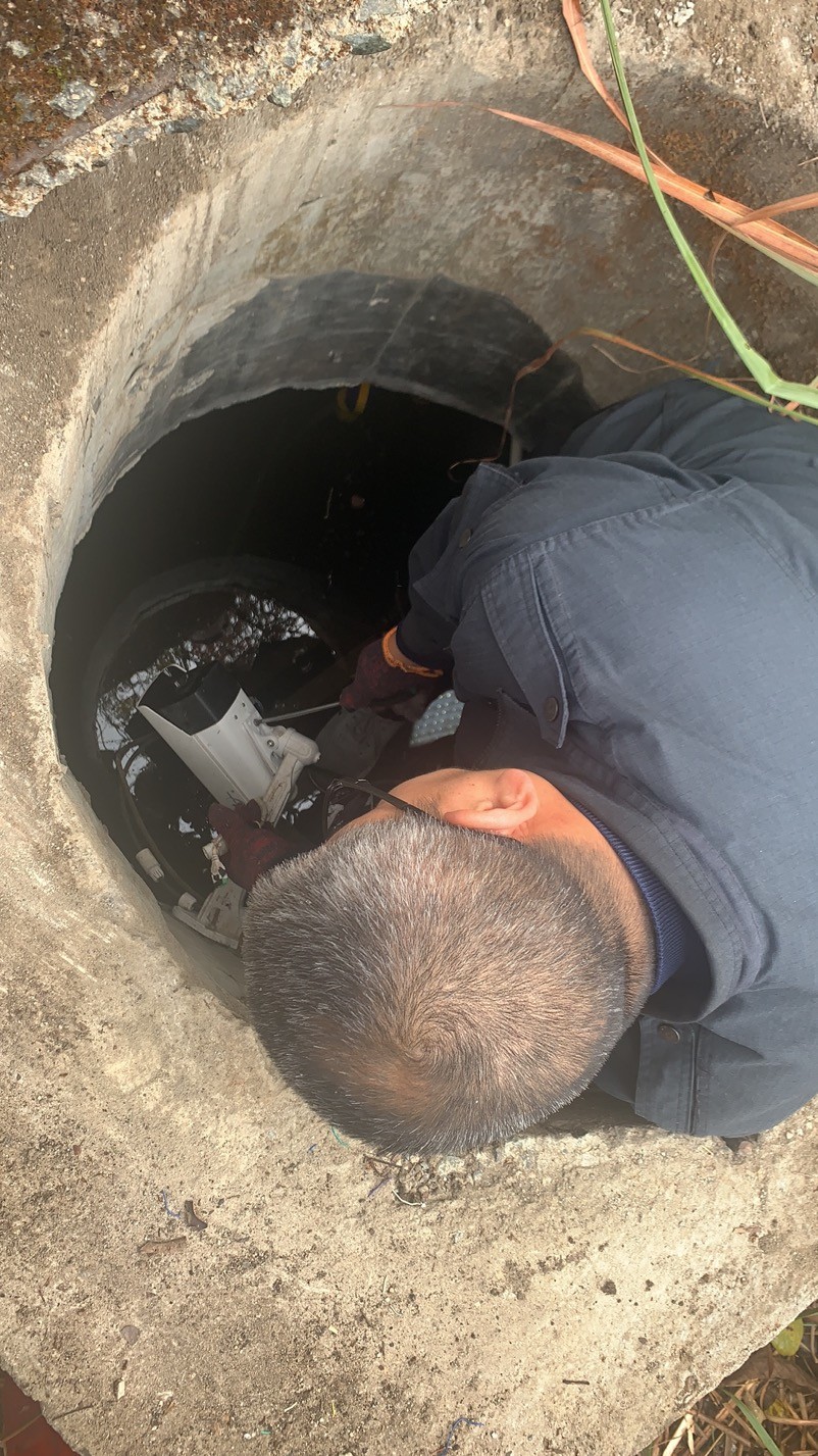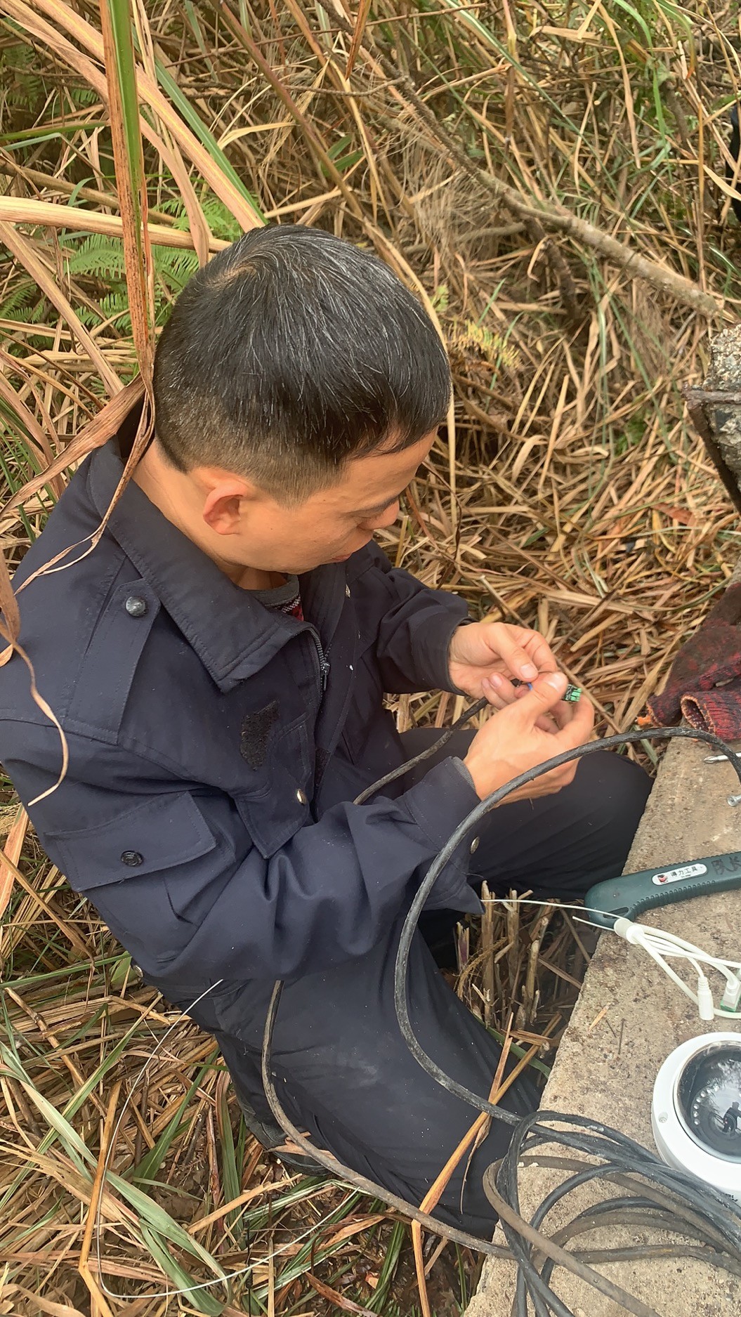 大溪嶺南高位水池地點(diǎn)在溫州地界,山體較高,攀行需要近一個(gè)小時(shí),金所得知情況后,立即帶著執(zhí)勤隊(duì)上山到高位水池檢查,他們背著工具箱,戴著手套、拿著柴刀,經(jīng)過一個(gè)小時(shí)的披荊斬棘來到南高位水池的井口,金所爬到井里進(jìn)行檢查,發(fā)現(xiàn)光纜和電線都被老鼠咬斷了,才導(dǎo)致圖像不能工作,當(dāng)場把電線接了回去,并回所準(zhǔn)備其他材料,明日再次登山修理。