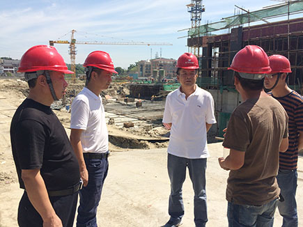 圖為公司工會(huì)主席項(xiàng)義超一行在文鼎苑項(xiàng)目工地檢查防暑工作