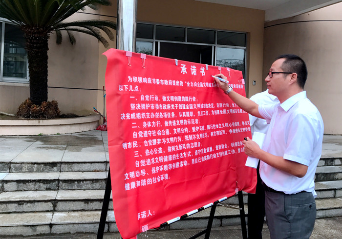 圖為動員會現(xiàn)場 章海峰要求大家充分認識創(chuàng)建全國文明城市的重要性,立足崗位,樹窗口形象,展行業(yè)新風,用自己的實際行動支持創(chuàng)建工作。此次創(chuàng)建工作,時間緊、任務(wù)重,需要全體人員迅速行動起來,從我做起,從細節(jié)做起,從點滴做起,逐層壓實責任,確保萬無一失。文明城市創(chuàng)建工作不僅僅是政府的事,更是全體市民的事,也直接體現(xiàn)了一個城市的幸福指數(shù),大家要以“一流的城市環(huán)境、一流的公共秩序,一流的服務(wù)水平、一流的精神面貌”迎接測評。