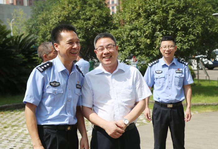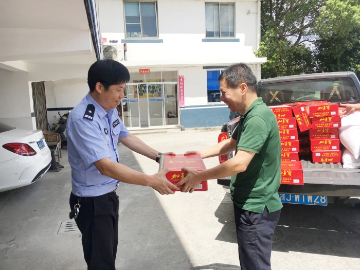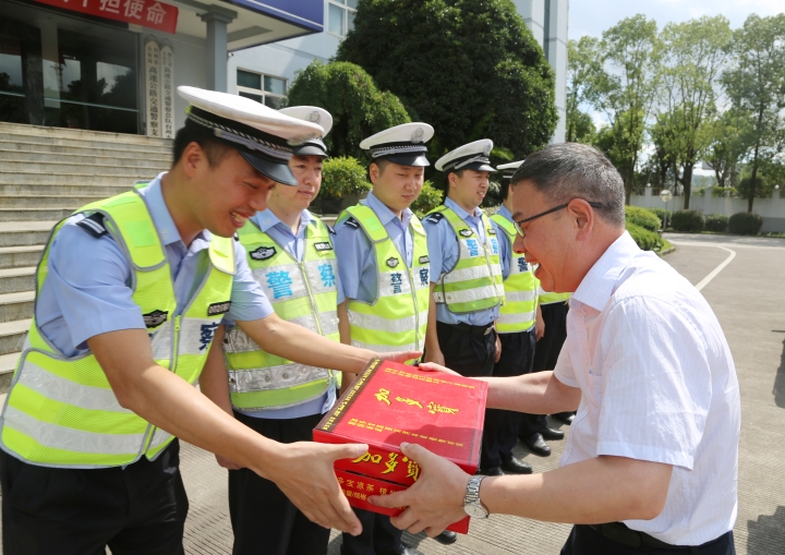 與此同時,集團(tuán)總工程師江輝帶領(lǐng)工程部及收費(fèi)所相關(guān)人員到院橋派出所和交警隊開展“送清涼”活動。江輝代表臺州高速集團(tuán)對當(dāng)?shù)嘏沙鏊徒痪牭穆穆毐M責(zé)、通力協(xié)作表示衷心感謝,并叮囑他們在高溫天氣要做好防暑降溫工作。