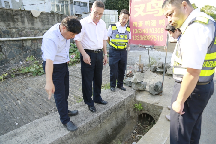 圖為陳文波檢查臺州收費站內(nèi)廣場隔離墻