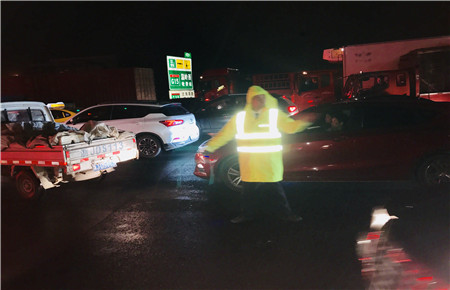 收費員汪洋冒雨沖進廣場,沉著冷靜指揮車輛有序進入車道,此時,駐勤人員紛紛出來協助指揮交通,迷亂雨霧中指揮秩序的熒光黃反光背心就是司乘人員的航標,指引著車輛有序平穩地通過收費站出口。