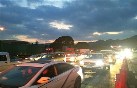3月4日驚蜇雷鳴,大雨瓢潑,大批車輛涌向溫嶺西收費所出口。