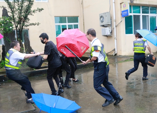 隨后,多名參演員工冒雨模擬收費(fèi)崗?fù)ず土嘘犗聧徳庥?/span>“歹徒”搶劫的情景開展防盜搶演練。現(xiàn)場,2名蒙面歹徒執(zhí)仿真刀、軟棍威脅收費(fèi)員交出現(xiàn)金,危機(jī)之中,收費(fèi)站立即啟動應(yīng)急處置預(yù)案并報警求助,收費(fèi)員有效與歹徒周旋,應(yīng)急處置組人員迅速攜鋼叉、橡膠棒、勞動工具等赴現(xiàn)場支援,值班領(lǐng)導(dǎo)、收費(fèi)班長、監(jiān)控員合力協(xié)作應(yīng)對歹徒,防盜搶演練順利結(jié)束。