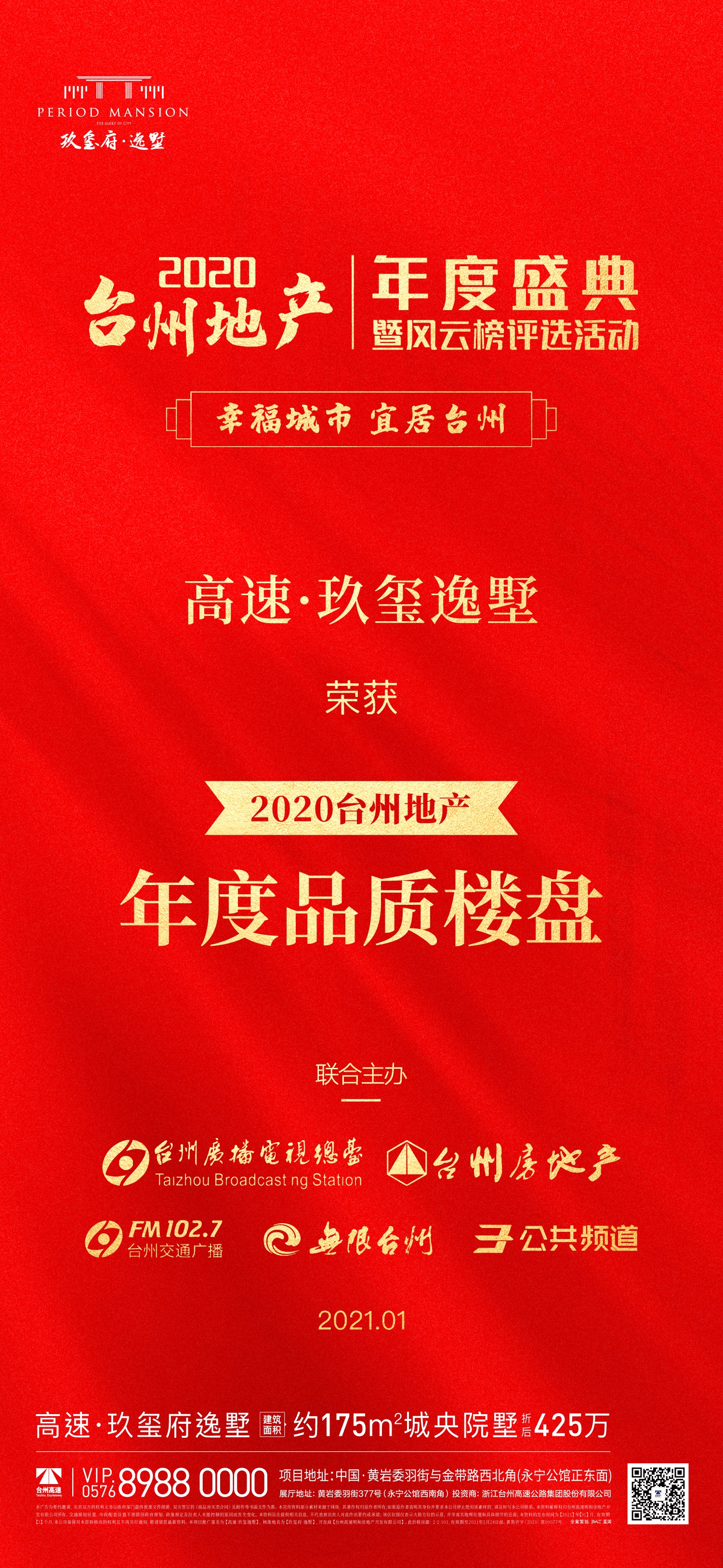 2021年1月19日下午,由臺(tái)州廣播電影電視集團(tuán)聯(lián)合臺(tái)州市房地產(chǎn)業(yè)協(xié)會(huì)共同舉辦的2020臺(tái)州地產(chǎn)年度盛典暨臺(tái)州地產(chǎn)風(fēng)云榜,在全城熱矚下重磅舉行。高速房產(chǎn)玖璽府·逸墅項(xiàng)目榮獲“2020臺(tái)州地產(chǎn)年度品質(zhì)樓盤”榮譽(yù)稱號(hào)。