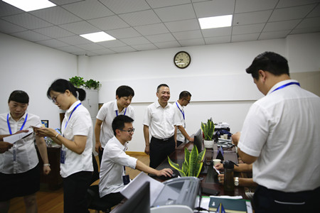 圖為集團(tuán)副董事長、總經(jīng)理張建平在臨海股權(quán)收購點(diǎn)檢查工作人員業(yè)務(wù)操作