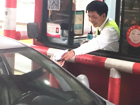 圖為工作人員向過往司機發放施工傳單