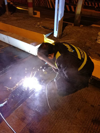 到了現(xiàn)場(chǎng),隊(duì)員發(fā)現(xiàn)該車道輪檢器鐵板螺孔由于不斷摩擦并逐漸變大,導(dǎo)致整顆螺栓脫離底下固定螺座,加之當(dāng)天是春節(jié)高速免費(fèi)第一天,車輛經(jīng)過(guò)時(shí)車速都較快,直接將整塊鐵板帶離底座。如果不及時(shí)對(duì)鐵板進(jìn)行加工恢復(fù),不僅不能保護(hù)下面的輪檢器,而且還有可能造成車輛爆胎。可除夕夜全部加工廠都已關(guān)門,如果讓廠家發(fā)貨至少也要好幾天。正在兩難之際,中心副經(jīng)理葉俊想到將鐵板與底座邊緣直接焊死的臨時(shí)應(yīng)急方法,待節(jié)后再向廠家定制或重新購(gòu)買。 方案有了,大家兵分兩組,一組去中心倉(cāng)庫(kù)拿電焊機(jī)、電焊條等設(shè)備,一組待在原地清理鐵底下方於泥等雜物,為隨后的電焊工作做準(zhǔn)備。設(shè)備到位后,葉俊一手操起電焊罩,一手熟練的將電焊條點(diǎn)在了鐵板與底座邊緣之間,經(jīng)過(guò)近一個(gè)小時(shí)的處理,輪檢鐵板與地面底座牢牢地固定在一起,再也不用被飛馳而過(guò)的車輛帶離。 項(xiàng)寅曉