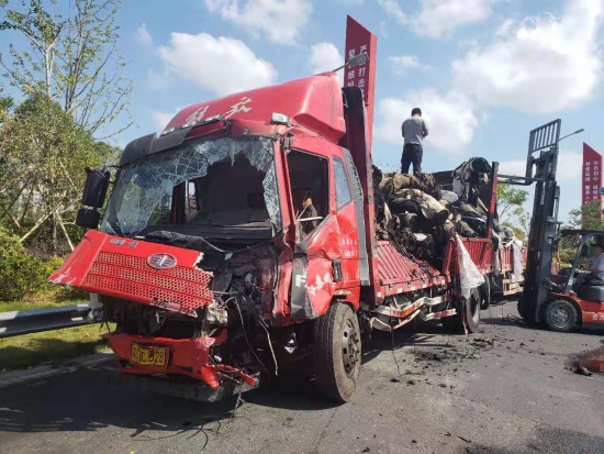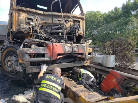 大火在現(xiàn)場留下了幾乎成為殘骸的兩輛車、滿地的油污、車輛碎片、燒剩下的布匹,一股刺鼻的臭味一公里外都聞得到。油污讓路道變得又膩又滑。更為嚴(yán)重的是,隨著時間的推移,從事故點開始,堵車開始一公里一公里的蔓延,幾乎快到了臺州收費所。