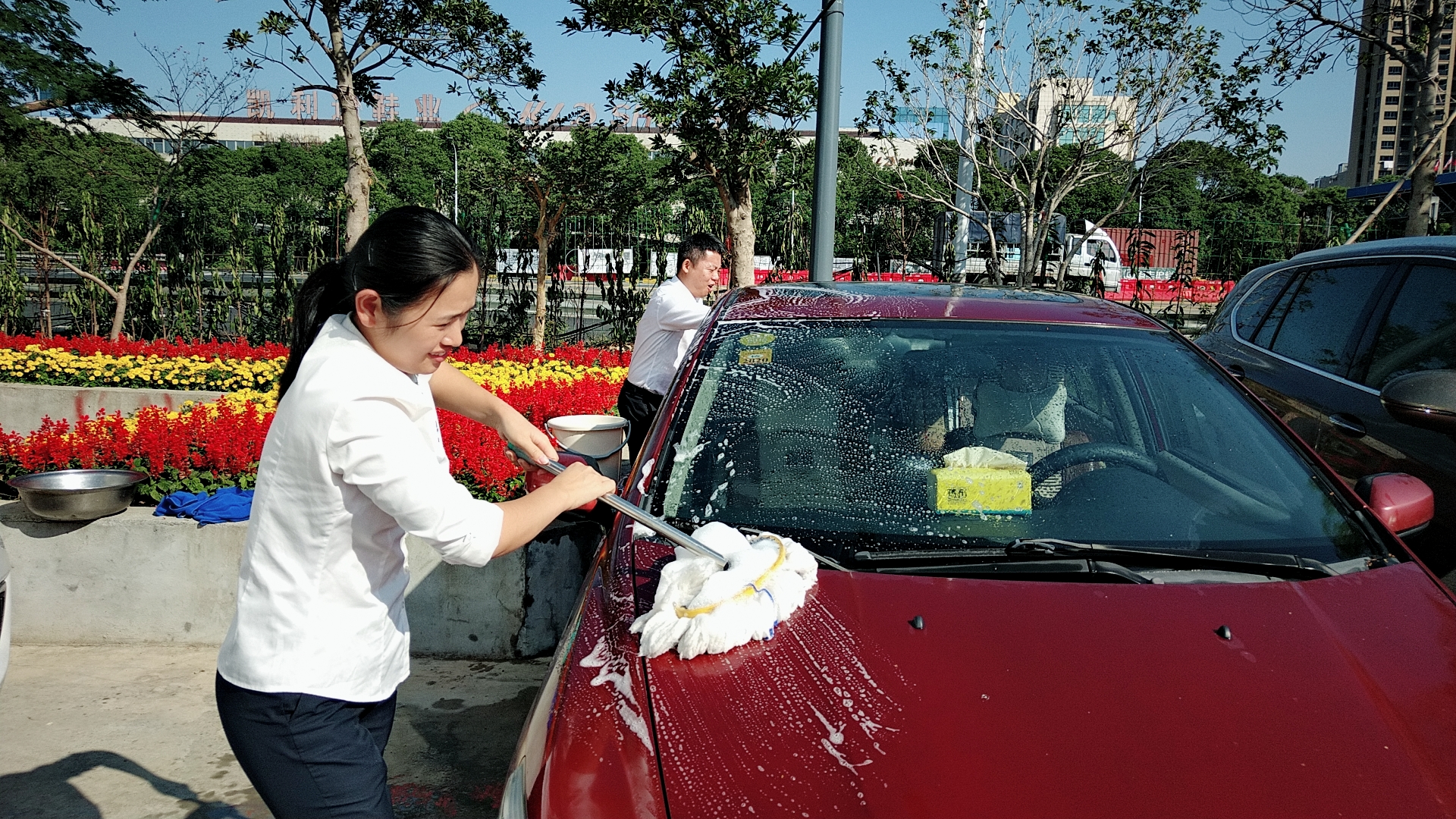 溫嶺西支部書記周超帶領黨員服務群眾 當天上午,活動一開始,前來洗車的車輛絡繹不絕。在支部書記周超的帶領下,五名黨員便開始分工合作。兩名男同志負責沖水、上泡沫、擦洗、再沖水,兩名女同志負責擦干和吸塵器清掃內室,還有一名男同志負責開車挪車,需要清洗的車輛一輛接著一輛,黨員同志們顧不得擦干身上的被水濺濕了的衣服,忙得不亦樂乎??粗幌吹靡粔m不染的車,大家都不約而同地會心一笑。