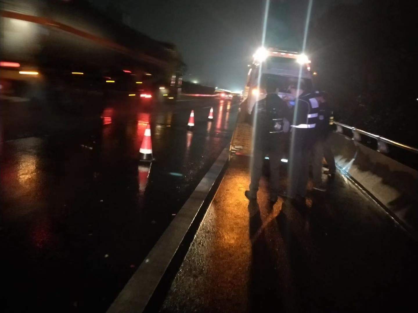 距離事故點最近的院橋駐點施救人員陳偉與潘志平接到指揮中心指令后分別駕駛一輛小拖車和一輛大拖車趕往現場進行拖車施救。在途經事故堵車后方路段時,另外一輛半掛車與兩輛小轎車追尾并撞到中央護欄,為了確保路段盡早通暢,他們決定將這起剛發生事故的車輛先拖離,前方事故則由黃巖駐點人員前來施救。