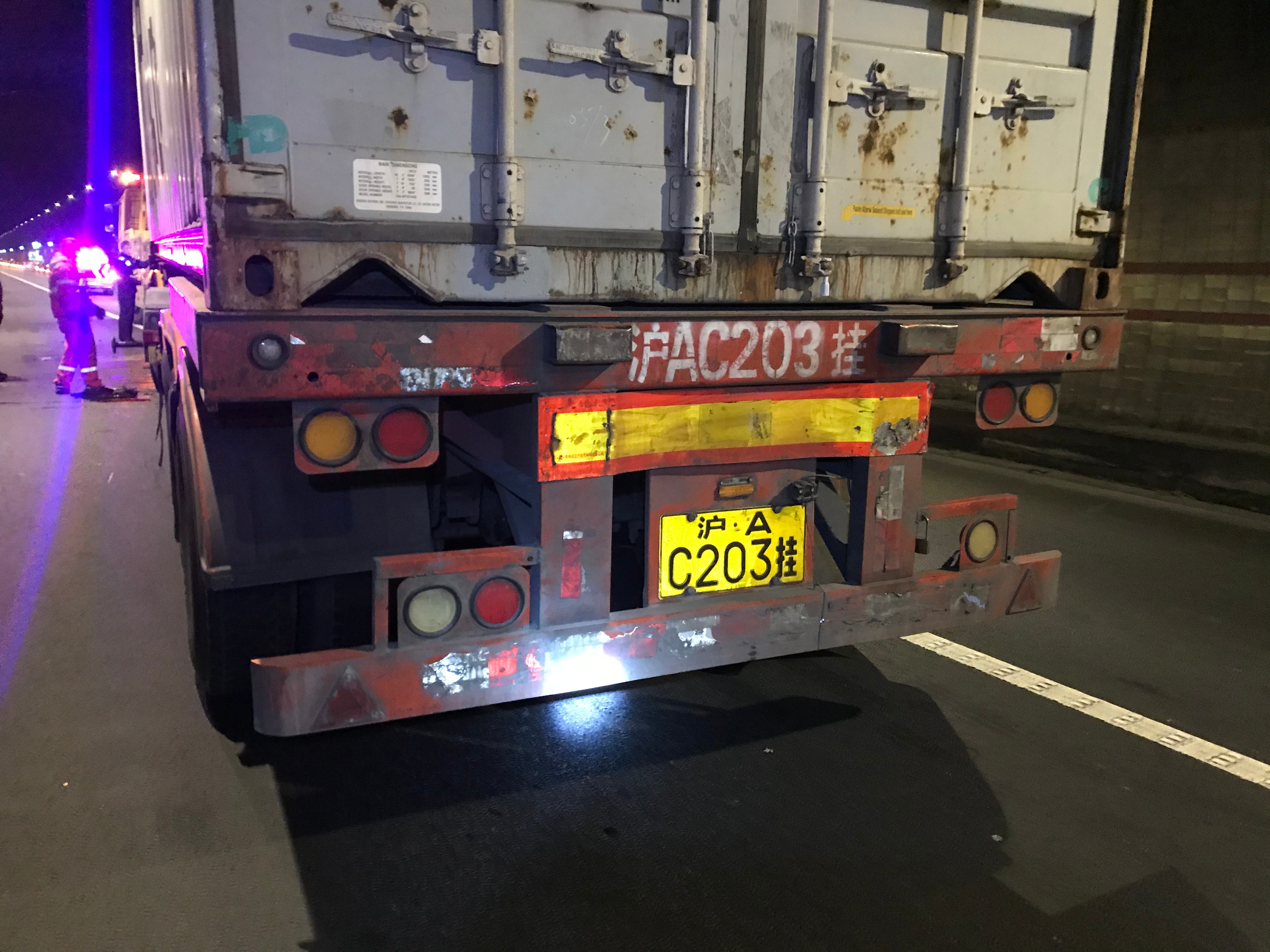 1月14日晚21:30分,甬臺溫高速寧波方向距離臺州南收費站約5公里的路段,一輛半掛車與一輛小轎車發生碰撞,現場急需一大一小兩輛拖車。