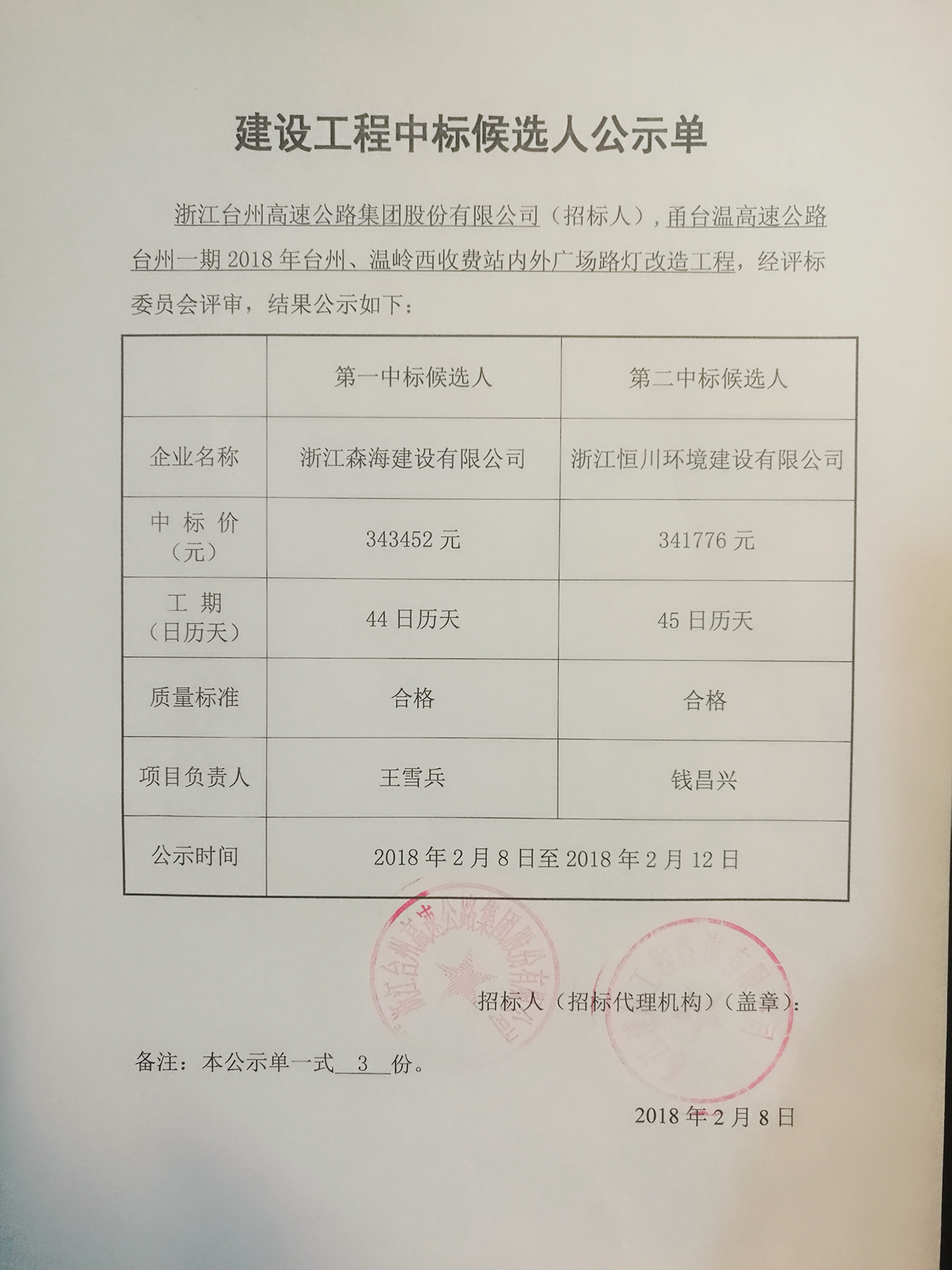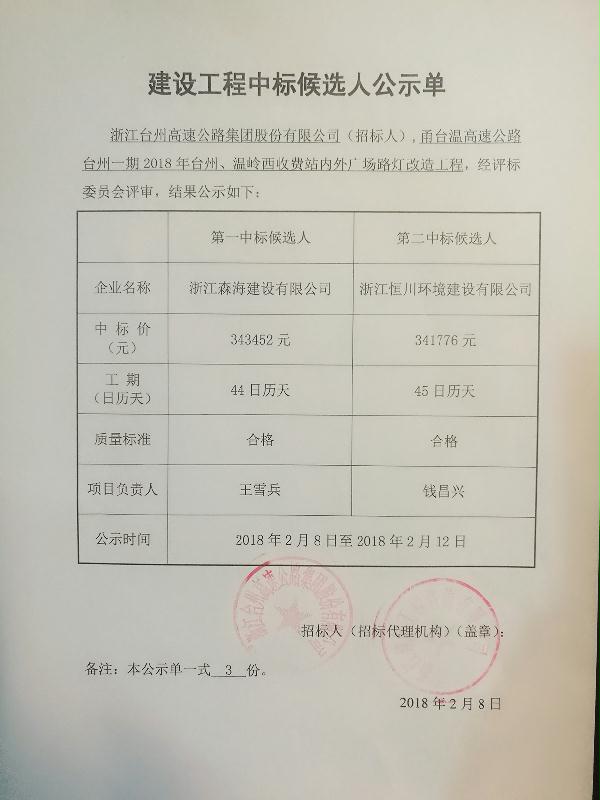 2018年臺州、溫嶺西收費(fèi)站內(nèi)外廣場路燈改造工程中標(biāo)候選人公示單