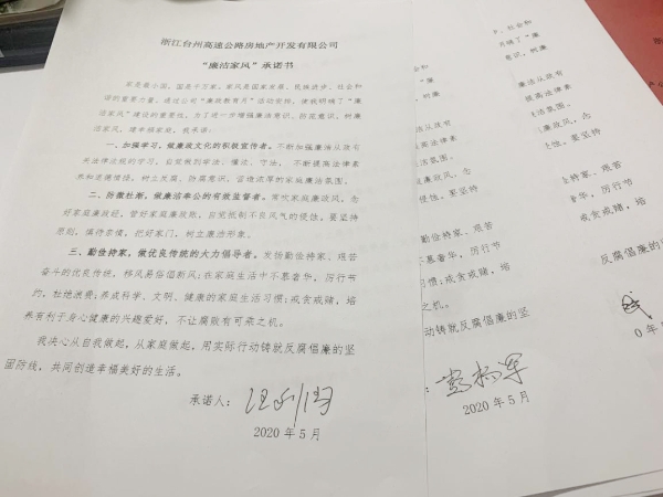圖為全體黨員觀看廉政教育短視頻《國畫》  圖為簽訂“廉潔家風”承諾書 根據(jù)集團公司《關于組織開展“廉政教育月”活動的通知》文件要求,為推動“不忘初心、牢記使命”主題教育常態(tài)化,深入學習貫徹黨的十九大和十九屆二中、三中、四中全會及十九屆中紀委四次全會精神,嚴守黨的政治紀律和政治規(guī)矩,更好地落實黨風廉政建設有關要求,高速房產公司黨支部組織了這次專題活動。全體參會人員一起觀看廉政教育視頻,宣讀“廉潔家風”倡議書,簽訂“廉潔家風”承諾書,開展“廉潔文明家風,黨員干部示范”大討論。 此次黨風廉政專題活動進一步增強了黨員干部的廉潔意識、防范意識,起到帶頭正品行、立家規(guī)、嚴家教、樹家風建設的表率作用,以好家風促黨風帶社風民風,為新形勢下臺州高速房產事業(yè)貢獻力量。 鄭攀
